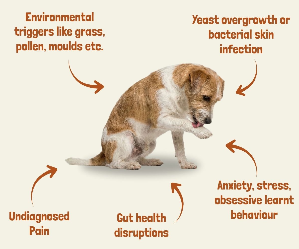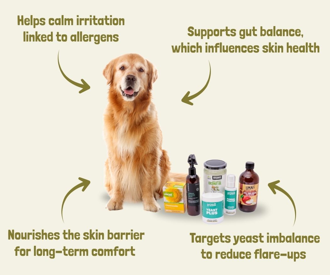 Itchy paws, redness, seasonal allergies and yeast irritation are common, and they often start inside the body.
