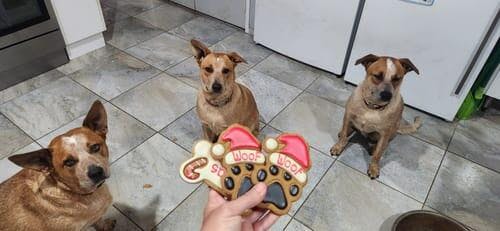 This delicious Honey & Vanilla homemade dog biscuit comes as a beautifully decorated Christmas Tree with WOOF banner and nothing but all natural ingredients. It is dog-a-licious!